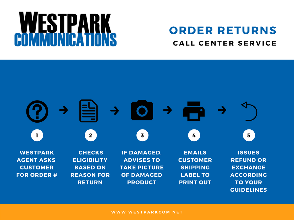 5. The customer receives the item. Ideally, this is the end of the process. However, sometimes returns are necessary. If selling items in which sizing is important, such as clothes, a smooth return process is essential. The return process and policies should be clearly spelled out on your website, and it often helps to include them with the packing slip. In many cases, the best way to handle returns is over the phone. This means you need to have call center personnel who know the process and who have the experience to handle a customer who may be angry. Customers who have received a broken or defective item are often unpleasant to deal with, but the call center workers have to be able to handle this without getting angry themselves. Outsourced call center agents know that it is easier to stay calm than people more emotionally invested in the product.